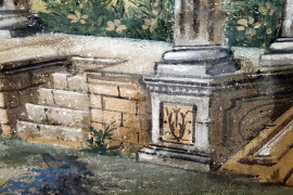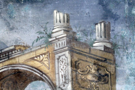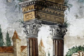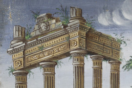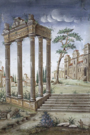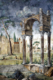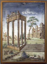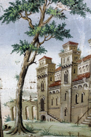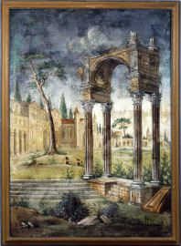 Coppia di paesaggi con architetture, olio su tela, cm 151x106,5, inizi XX secolo, entro cornici, (difetti).