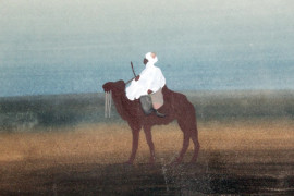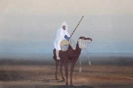 Coppia di paesaggi orientali, acquarello su carta, cm. 21,5x49, XX secolo, entro cornici.
