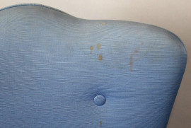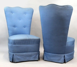Coppia di poltroncine da sala, metà XX secolo, alto schienale e seduta rivestiti in tappezzeria azzurra, cm h 90, (difetti).