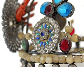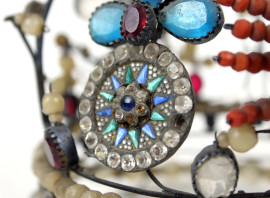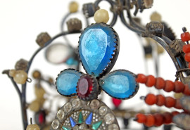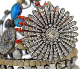 Corona in metallo argentato con inserti gemmati, inizi XX secolo, cm h 12x11,5, (difetti e mancanze)