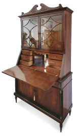 Credenza a doppio corpo in noce, Inghilterra, XIX secolo, parte superiore a due sportelli a vetri piombati, parte inferiore a tre cassetti ed uno sportello a calatoia celante sei cassetti e vano a giorno, cm h 233x143x49, (segni del tempo).
