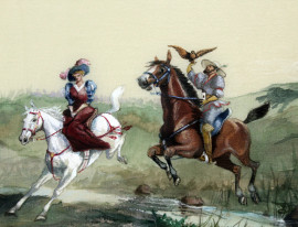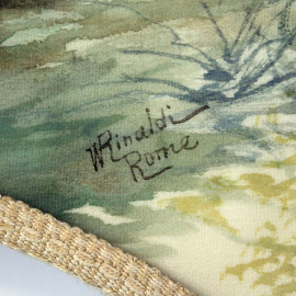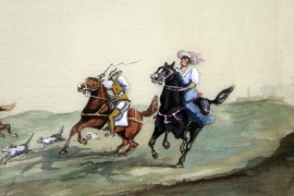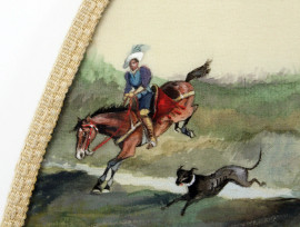 Dipinto su seta raffigurante scena di caccia, cm 44x78,5, firmato in basso a destra.