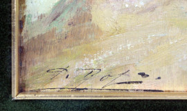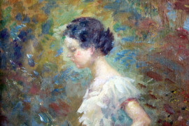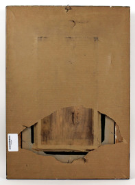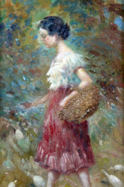 Donna con cesto, olio su tavola, cm 35,5x19,5, firmato, entro cornice.