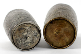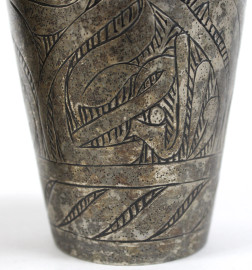 Due bicchieri in metallo inciso a motivi vegetali, altezza max cm. 12,5, (difetti).