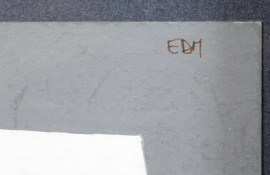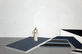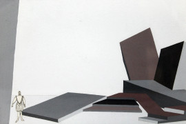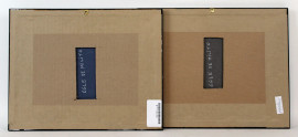 Egle De Milito, lotto di due dipinti raffiguranti scenografie metafisiche per "La notte dell'Epifania", tempera su carta, cm 17,5x24,5, entro cornici