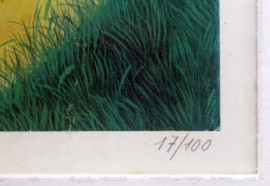 Lotto di due serigrafie a colori, cm 72x54, entro cornici