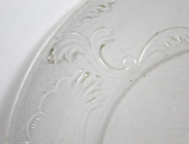 Grande piatto in ceramica bianca, tesa con decori a rilievo, diametro cm. 34, Bassano, XX secolo, (lievi difetti).