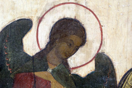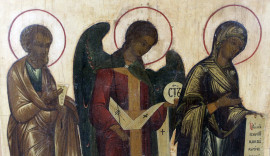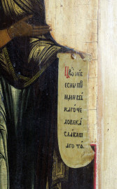 Icona russa del XIX secolo, raffigurante Madonna, l'Arcangelo Michele e San Pietro, tempera su tavola, cm 53,5x43,5