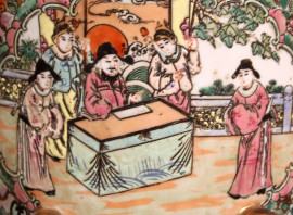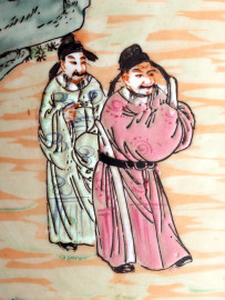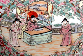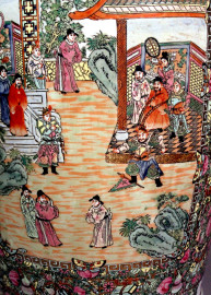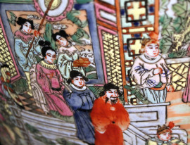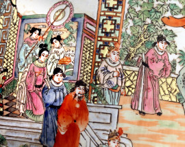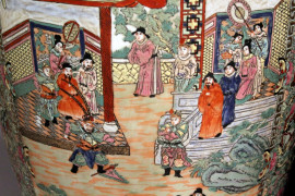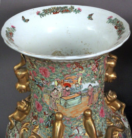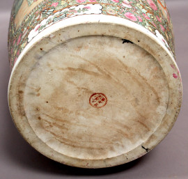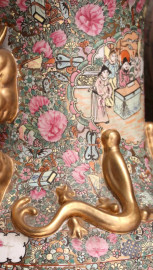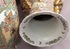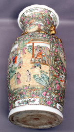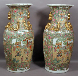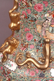 Importante coppia di vasi cinesi in porcellana dipinta con riserve raffiguranti scene di corte, particolari dorati, altezza 92,5 cm, prima metà del XX secolo, marcati alla base.