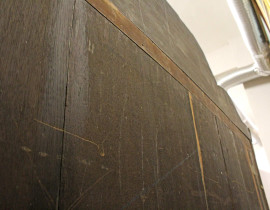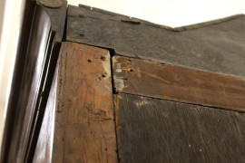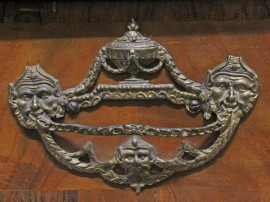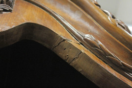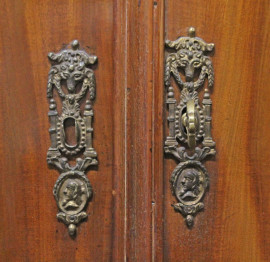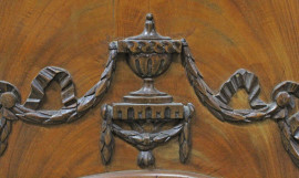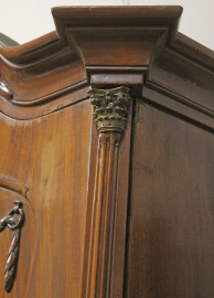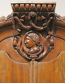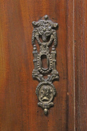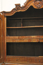 Importante trumeau del XVIII secolo in piuma di mogano, fronte bombato a due ante sagomate e tre cassetti, cappello mosso con cimasa riccamente intagliata, finiture in bronzo, cm h 250x190x60, (segni del tempo)