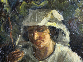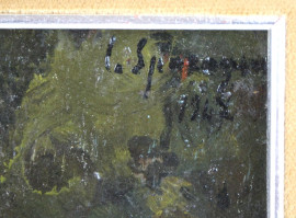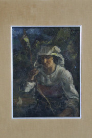 La filatrice, olio su cartone, cm. 26x20, inizi XX secolo, cm. 26x20, entro cornice.