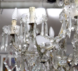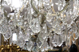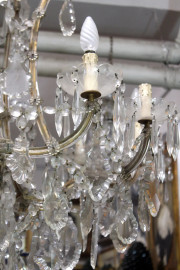 Lampadario in vetro, a undici luci, adornato da gocce e pendenti in cristallo, altezza cm. 105, (difetti)