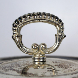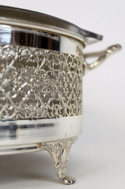 Legumiera in Sheffield, due prese laterali e fascia traforata, poggiante su quattro piedi ferini, cm h 18x21,5x28, XX secolo, (segni del tempo).