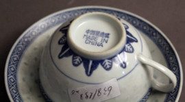 Lotto composto da quattro piatti e due tazzine in maiolica, manifatture ed epoche diverse, (difetti).