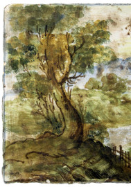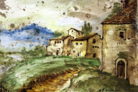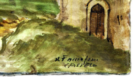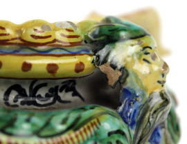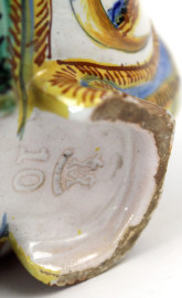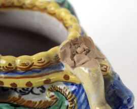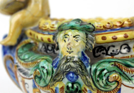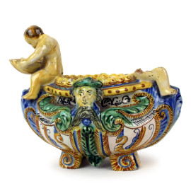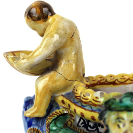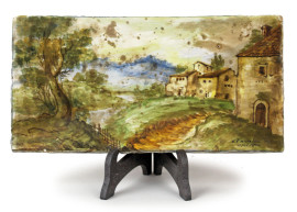 Lotto composto da una mattonella in maiolica raffigurante paesaggio, firmata N. Facciolini Castelli, ed una saliera in maiolica policroma a forma di navicella con putto reggi-conchiglia, misure mattonella cm 14,5x29x3,5, misure saliera cm 16x20x12