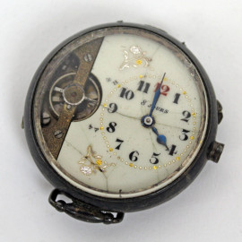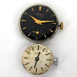 Lotto di cinque meccanismi di orologio in materiali diversi, (difetti e mancanze).