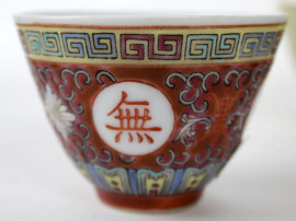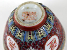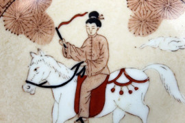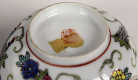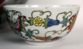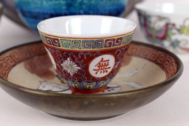 Lotto di sei oggetti in ceramica e porcellana policroma, diametro max cm 29,5, arte orientale, XX secolo, (difetti)