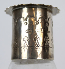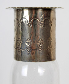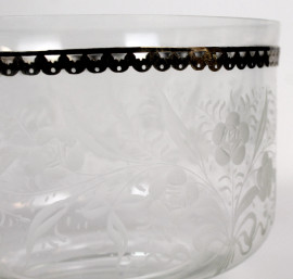 Lotto di una bottiglia ed un centrotavola in vetro inciso a decoro di fiori, finiture in argento, altezza max cm 26,5, (mancante tappo della bottiglia)