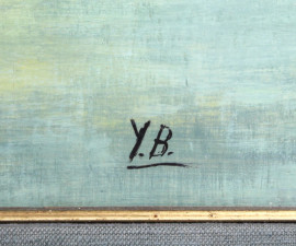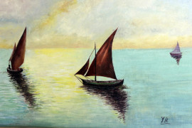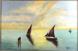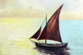 Marina con imbarcazioni, olio su tavola, cm. 39x59, siglato, entro cornice.