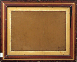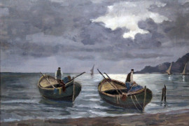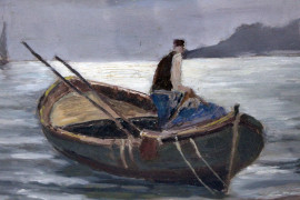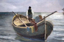 Marina con pescatori su barca, olio su tela, cm 70x50, entro cornice.