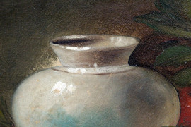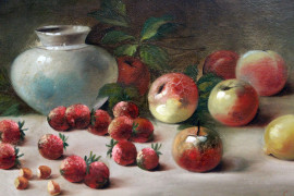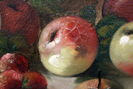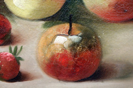 Natura morta con frutta, olio su tela, cm 50x60, firmato, entro cornice, (piccole cadute di colore).