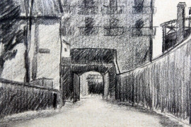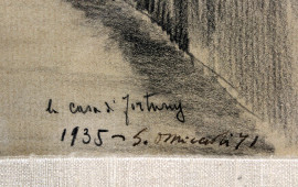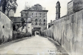 La casa di Fortuny, matita su carta, cm 30x40, titolo,firma e anno in basso a destra, entro cornice.