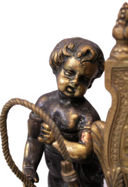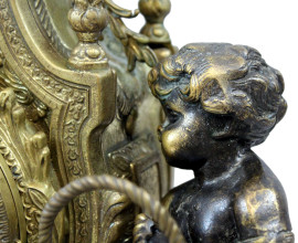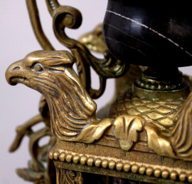 Base decorata con stemma e coppia di fauni, quadrante a numeri romani, parte superiore della cassa ornata a motivi di volute, foglie e teste di aquile.