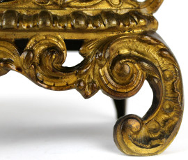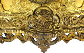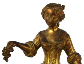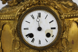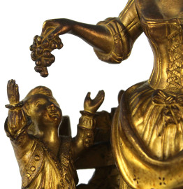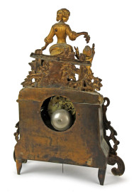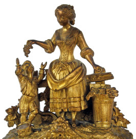Orologio da tavolo in antimonio sormontato da figura femminile e fanciullo, quadrante circolare a numeri romani, cm h 43x32x9, (difetti e mancanze)