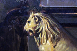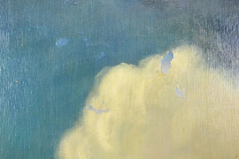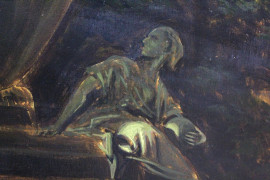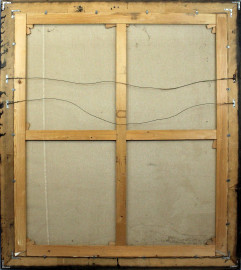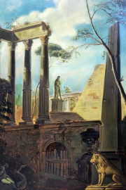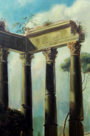 Paesaggio con architetture e figure, olio su tela, cm 150x130, XX secolo, entro cornice, (piccole cadute di colore)