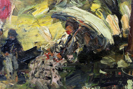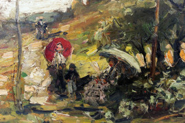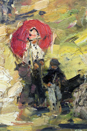 Paesaggio piemontese con figure, olio su tavola, cm 30x40, firmato e datato a tergo.