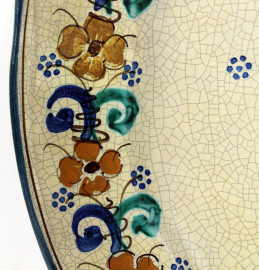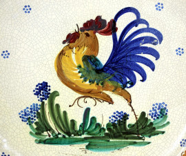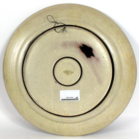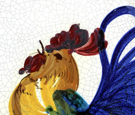 Piatto in ceramica policroma con figura di gallo, diametro cm. 41, firmato Oronzo Patronelli Grottaglie, seconda metà XX secolo.