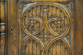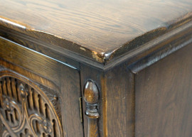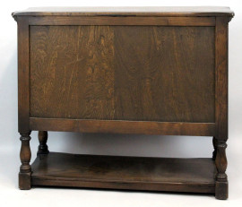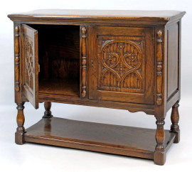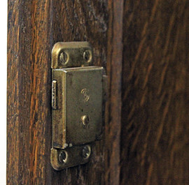 Piccola credenza in rovere a due sportelli, poggiante su quattro gambe legate da piano, Nord-Europa, inizi XX secolo, cm h 98x101x44