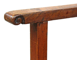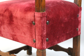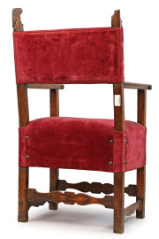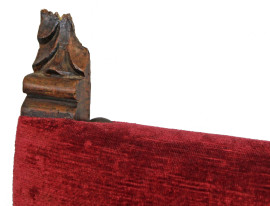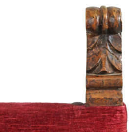 Poltrona in noce, con fiamme intagliate sulla sommità, imbottita e rivestita in velluto bordeaux, alt. cm 119, (difetti)