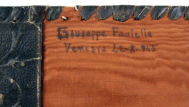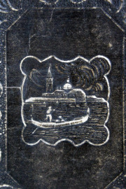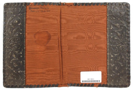Porta documenti in pelle, decorato con tralci vegetali e veduta di Venezia entro riserva, cm. 23x17, (difetti).