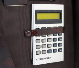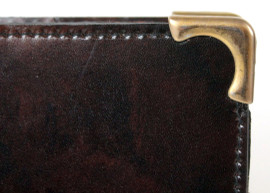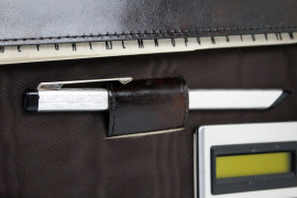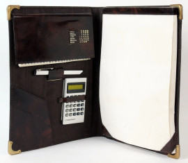 Portadocumenti in pelle, calcolatrice, penna, rubrica e blocco note all'interno, finiture in metallo dorato.