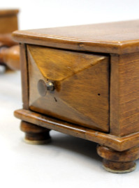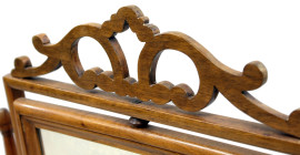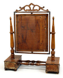 Psiche da comò in noce, inizi XX secolo, cimasa traforata, specchio regolabile, montanti a balaustro poggianti su due cassetti riuniti da doppia traversa, piedi a cipolla, cm h 71x57x24.