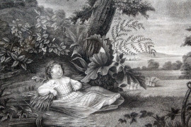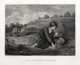 Quattro stampe raffiguranti "Ragazza che raccoglie i funghi", "Bambino che taglia felci", "Il figlio del mietitore" e "Piccolo pulitore", cm 42,5x57, inventore Drauunby, incisore A.Zaffonato, entro cornici, (macchie).