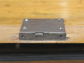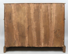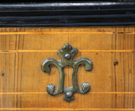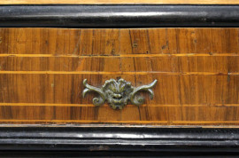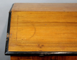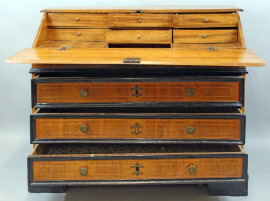 Ribalta del XVIII secolo, in noce con filettature in bosso e profili ebanizzati, fronte a tre cassetti e sportello a calatoia celante scarabattolo con sei cassettini, cm h 101x117x56, (difetti)