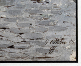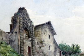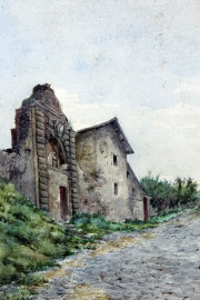 Scorcio di strada con rovine, acquarello su carta, cm. 35x25, siglato e datato, entro cornice