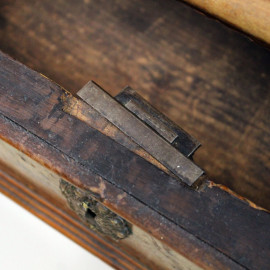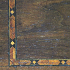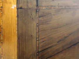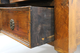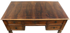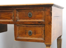 Scrivania in stile Luigi XVI, inizi XX secolo, in noce con filettatura in vari legni pregiati, fronte a cinque cassetti, poggiante su quattro gambe troncopiramidali, cm h 81x115x62, (segni del tempo).