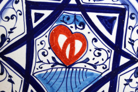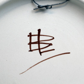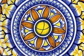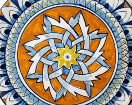 Sei piatti piani in maiolica dipinta in policromia a motivi vegetali e geometrici, diam. cm 25,5, marcati alla base, XX secolo, (segni del tempo).