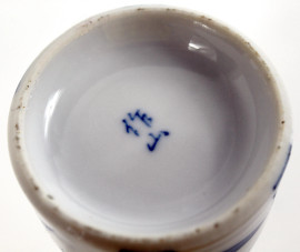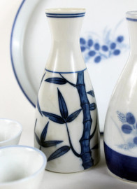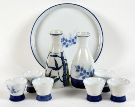 Servizio da Sakè in porcellana bianca e blu, composta da un vassoio di linea tonda (diametro cm. 19), sei tazzine (altezza cm.4x4,5), due bottiglie (altezza cm. 13), tot. 9 pz.