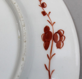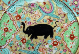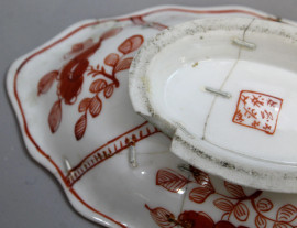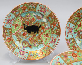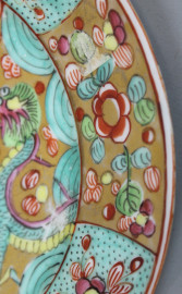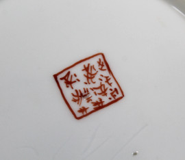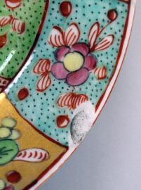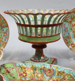 Servizio in porcellana policroma composto da: sei piattini, tre alzate centrotavola e un'antipastiera, manifattura orientale, inizi XX secolo, (difetti e restauri)