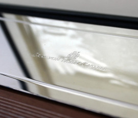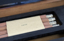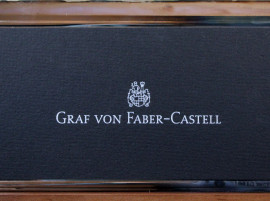 Set da scrivania Graf von Faber-Castell in legno e metallo, composto da quattro matite, quattro gommini e un temperino, cm 25,5x13,5x2