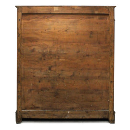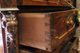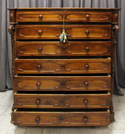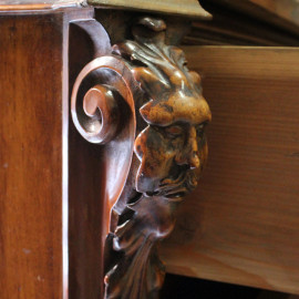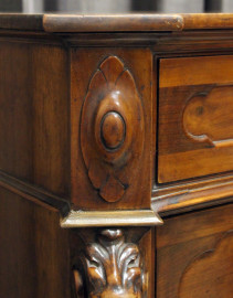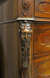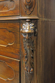 Settimino in noce, fine XIX secolo, piano di linea sagomata, fronte a sette cassetti e laterali scolpiti a motivo di protomi zoomorfe, cm h 152x128x52, (segni del tempo).