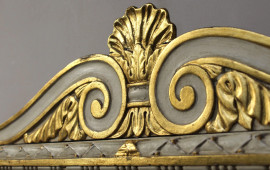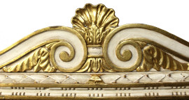 Specchiera in legno intagliato, laccato e dorato, fine XIX secolo, cimasa intagliata a doppia voluta con conchiglia, cm 119x110