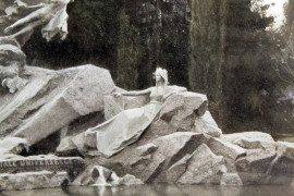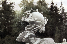 Stampa raffigurante "Unione postale Universale" monumento intitolato "Autour du Moude", 30x43 cm, entro cornice.