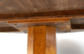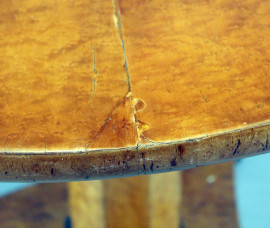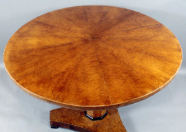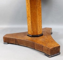 Tavolo tondo in radica, gamba centrale ottagonale poggiante su basamento triangolare, altezza cm. 78, altezza cm. 78, XIX secolo, (difetti).