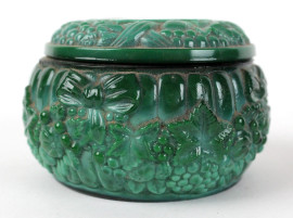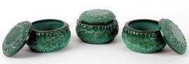 Tre cofanetti in malachite, decori a festoni, altezza cm. 10, diametro cm. 9.