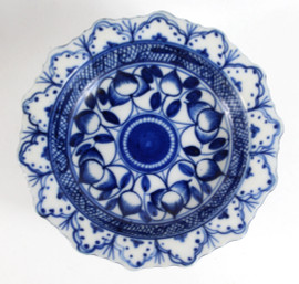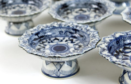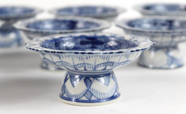 Undici alzatine in porcellana bianca e blu, altezza cm. 4,5, diametro cm. 10, Cina, antica manifattura.
